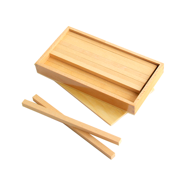 Extra smallest stair for Brown Stair can also be used as a manipulation work. 19 wooden prisms (1 x 1 x 20cm) with natural wood finish in a wooden box with lid.