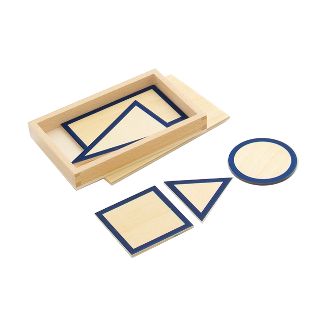 The Geometric Plane Figures allow a child to explore the Geometric Solids further, and learn their bases. A box containing 5 pieces of wooden plane figures for Geometric Solids.