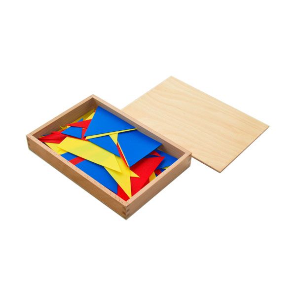 The Detective Adjective Triangles help the child understand adjectives. A wooden box with lid containing 7 different types of triangles, each in 3 colors and each in 3 sizes. Made of PP board to enhance durability.