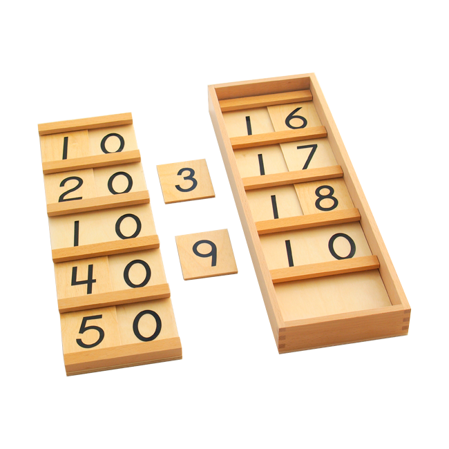 The Teen Board uses the knowledge of the bead stair to introduce the quantities and vocabulary of numbers 11-19. A wooden box with lid containing 2 teen boards (teaching 11-19) and 9 wooden cards with the numerals 1-9 printed in USA print.