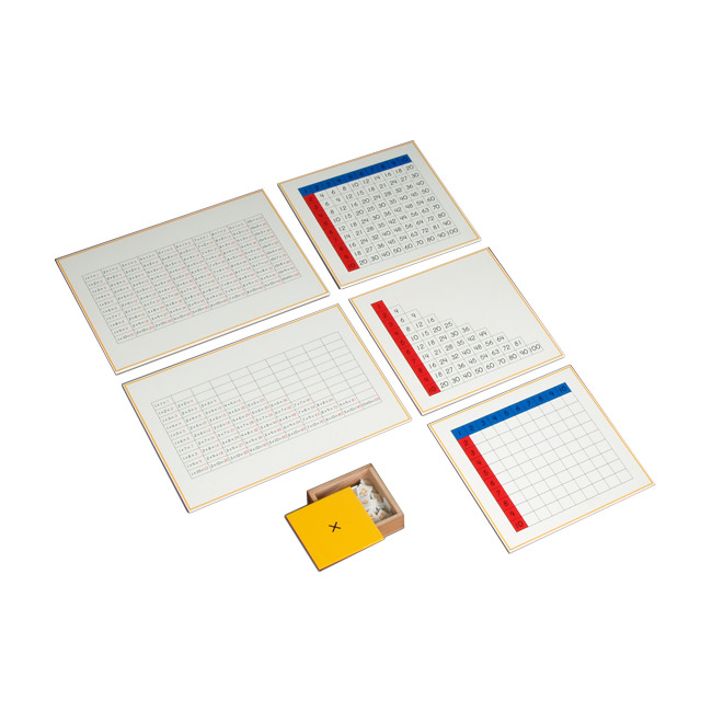 The Multiplication Working Charts are a tool used to practice and memorize multiplication facts. The set contains: 2 control charts, 3 working charts, and a box of answer chips.